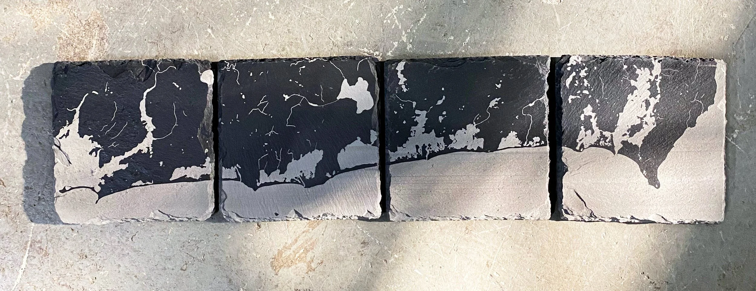 SLATE COAST(ERS) // Four slate coasters combined to create the Rhode Island Southern shoreline from Westerly to Pt. Judith, Narragansett.